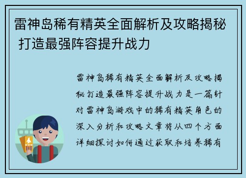 雷神岛稀有精英全面解析及攻略揭秘 打造最强阵容提升战力