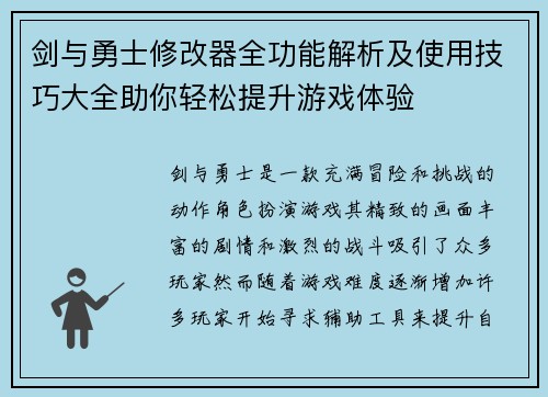 剑与勇士修改器全功能解析及使用技巧大全助你轻松提升游戏体验